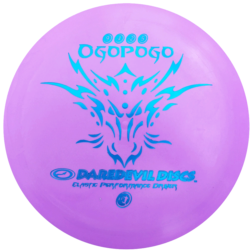 Produced in plastic usually reserved for putters, the ‘Ogopogo’ takes all the great qualities of the ‘Sabertooth/Mammoth’ and ‘Buffalo’, and gives the thrower one more thing;, stopping ability. The ‘Ogopogo’ doesn’t skip on grass, cement or dirt and when it hits a tree, it just drops and stops with no roll away, making it an awesome hill disc. Because of the nature of the ‘Elastic Performance’ plastic, this is not a disc for power throwers, it performs best at about 85% arm speed and is great in the cold.